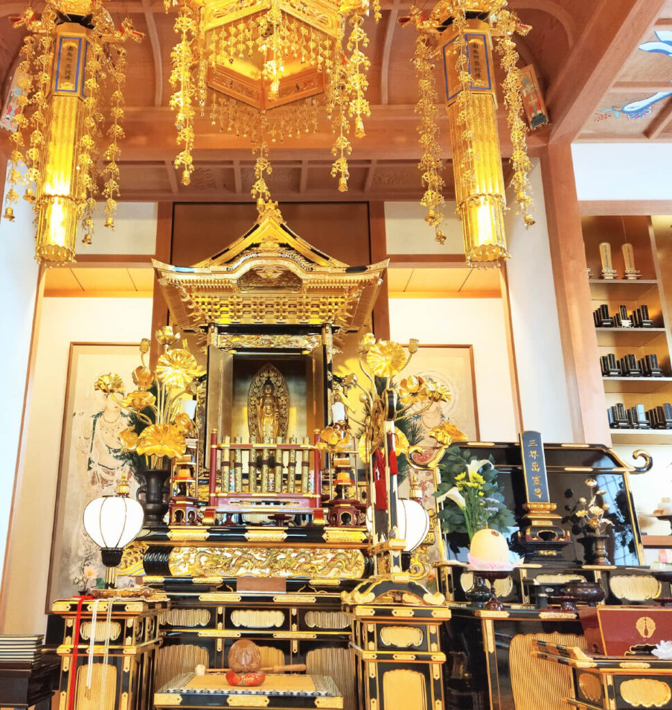 The old main hall of Amenji was unfortunately burned down by air attacks during World WarⅡ. Current main hall was rebuilt in 2013, and the small statue of Amida Budda that could survive the fire is enshrined respectfully with holy cross on the ground floor of main hall.