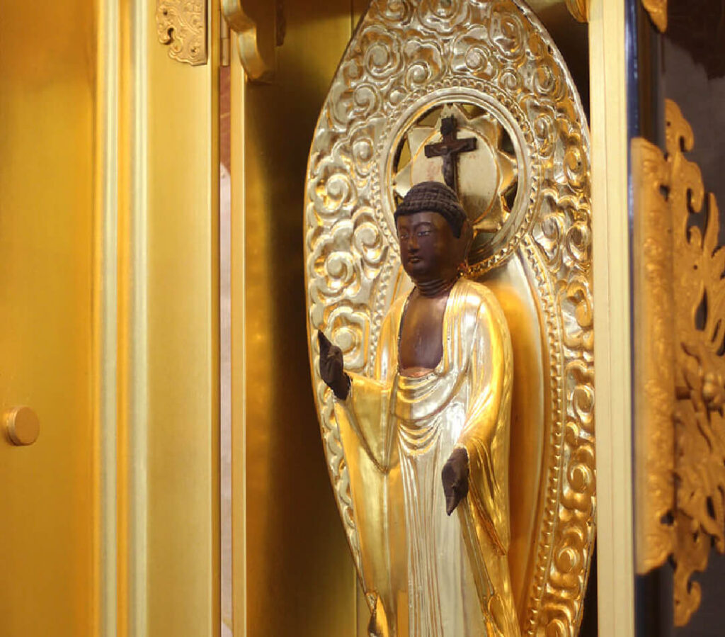 先の第二次世界大戦での堺空襲により、総檜造りの本堂、ご本尊、庫裏は全て消失してしまいましたが、もともと脇におまつりしていた小さな阿弥陀如来が唯一戦火を免れました。戦後に亡きキリシタンの供養にと十字架を教会からいただき、光背に取り付けて現在一階の仏間の正面におまつりしています。焼失した旧のご本尊の蓮台には蓮の花を抜くと十字が刻まれていたと聞いております。