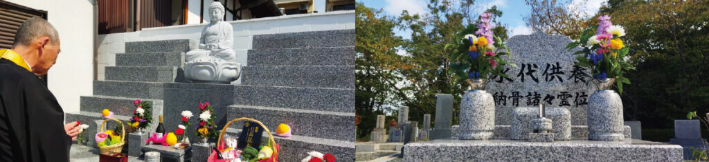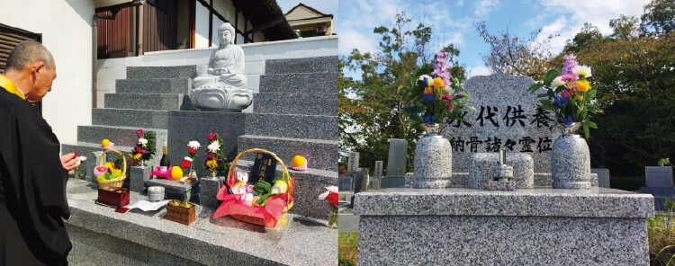 1霊位、3万円でご納骨いただけます。お名前を刻む供養碑を建立される場合は1基につき30万円となります。また阿弥陀様のひな壇の裏側に、合同でなく個別に納骨するスペースもございます。そちらは1霊位15万円で20年間の預かり後、合同墓に埋葬します。いずれも年間管理費は別途3,600円必要です。